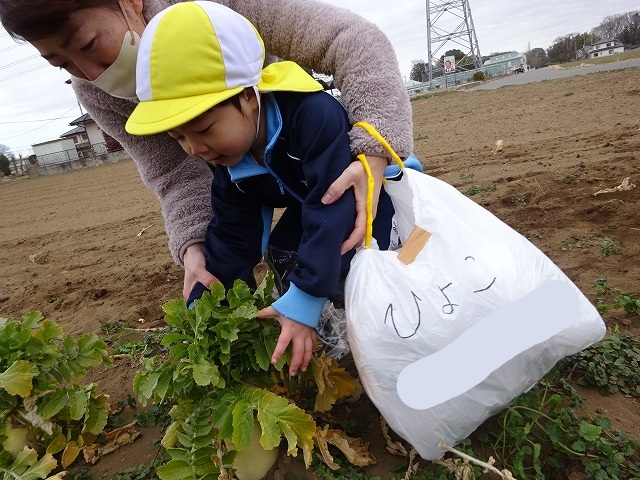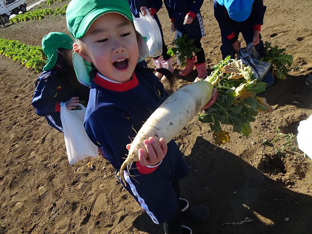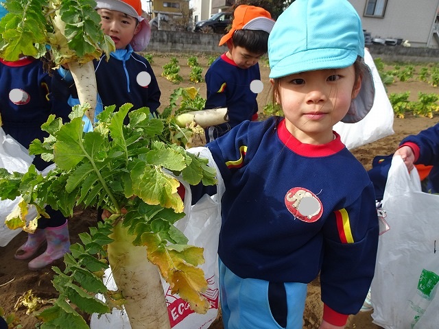 子どもたちは自分の力でだいこんを土から引き抜きます💪