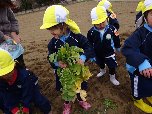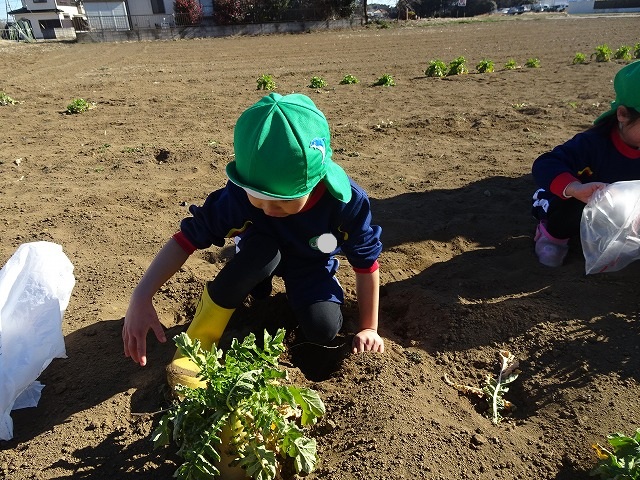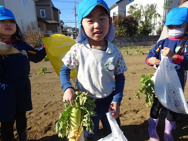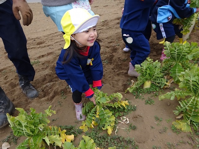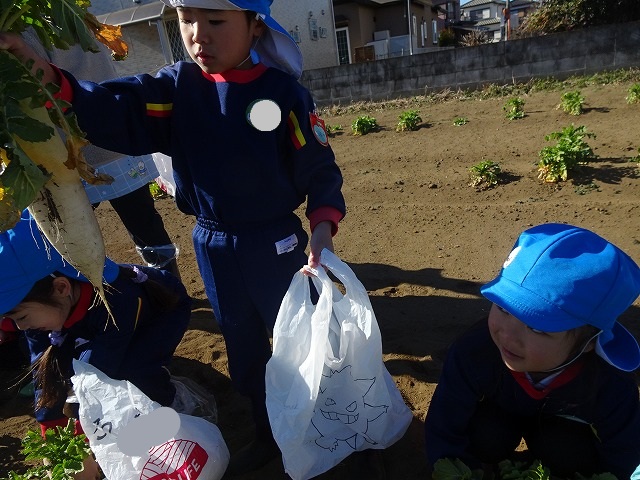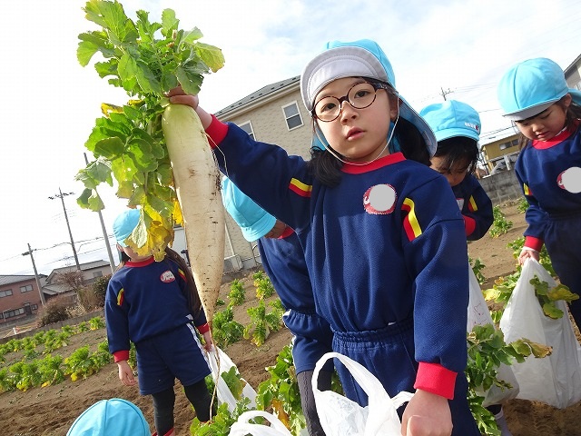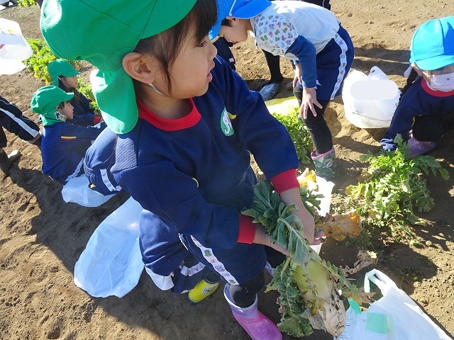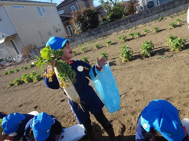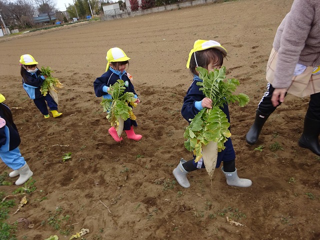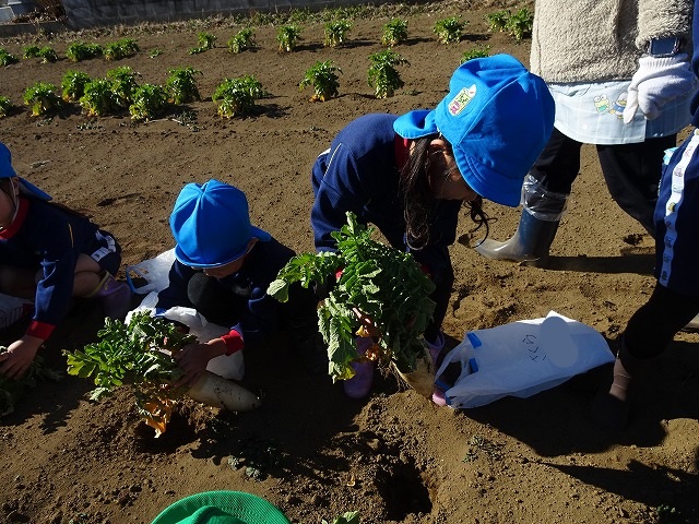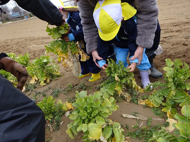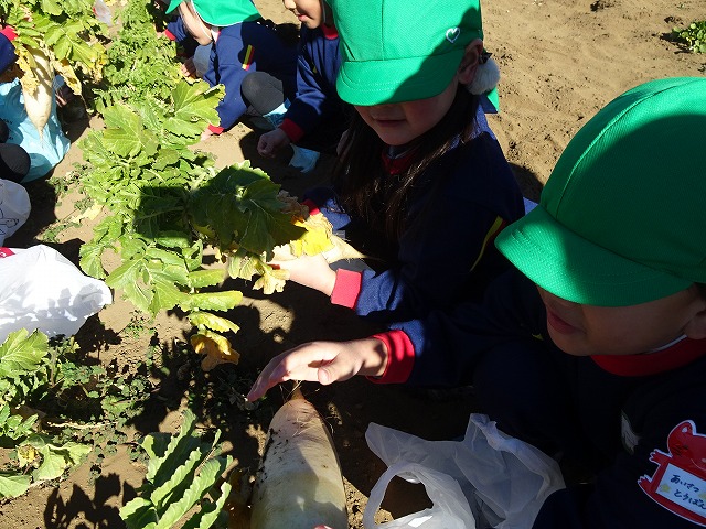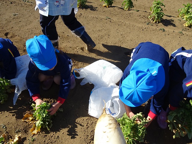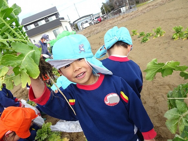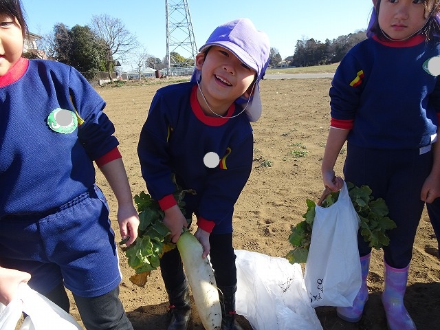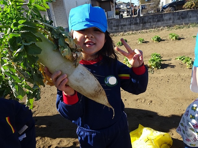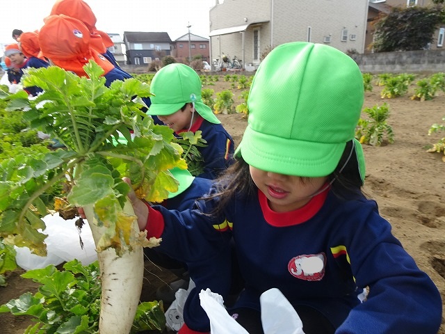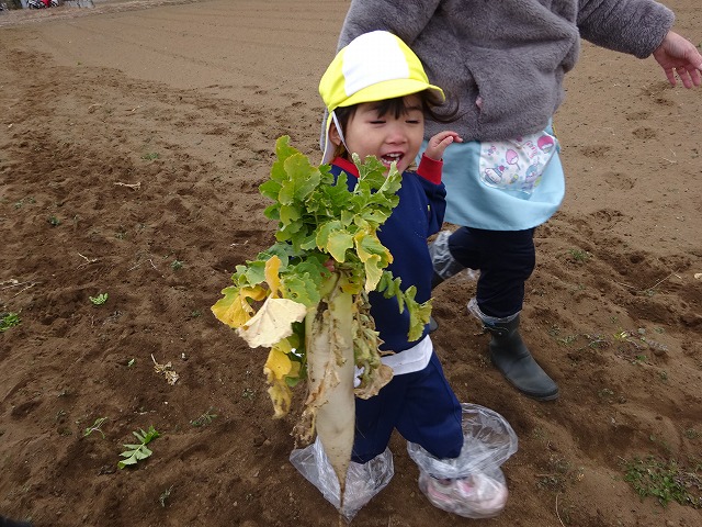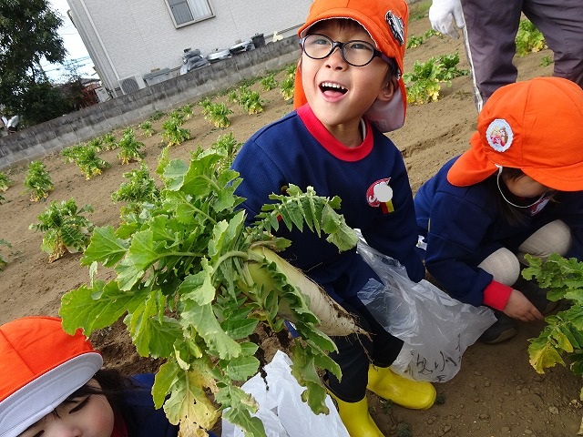 子どもたちは自分の力でだいこんを土から引き抜きます💪