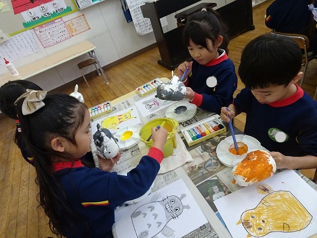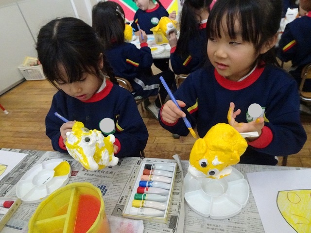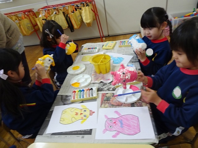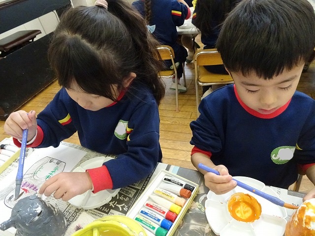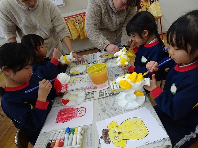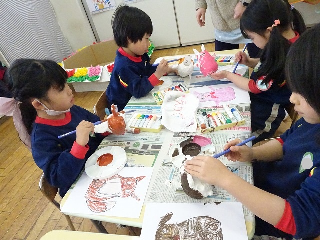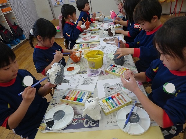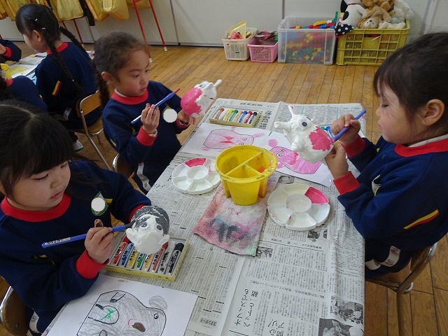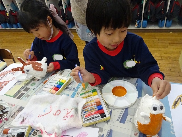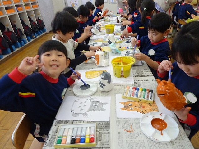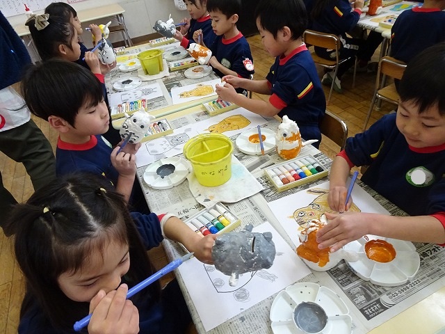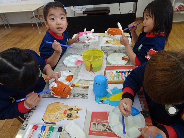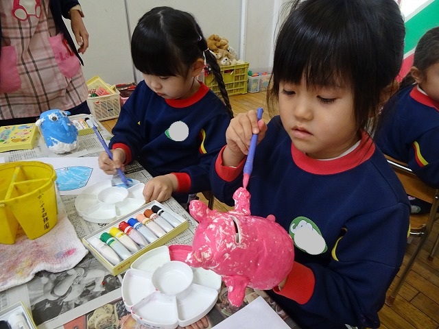 園のようす / 2026年1月21日 ちょきんばこの色付け こんにちは! 今回は貯金箱の色付けの様子をお伝えします📸 さて、何回かの工程に分けて制作している貯金箱 今回は色付けをしました🖌 こちらも2月の作品展に展示されます お楽しみにしていてくださいね!☺ 本日の様子📸