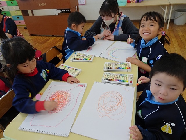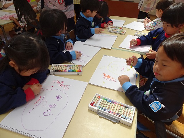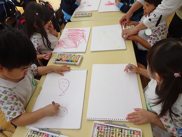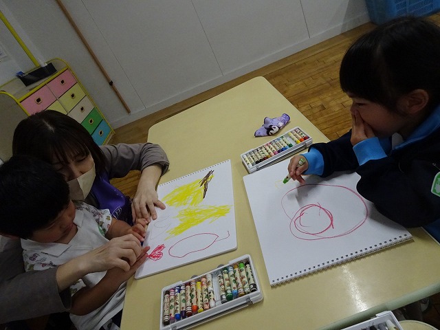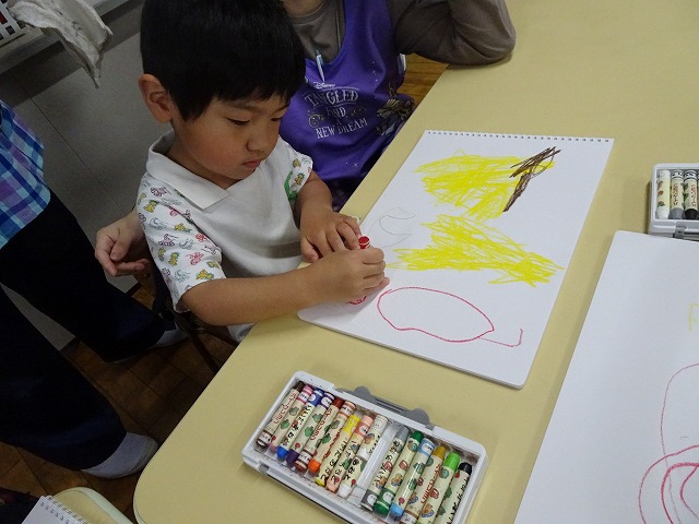 クレヨンで線を描く感触を楽しむ子や、動物やお顔をイメージして描いている子、