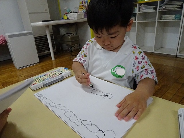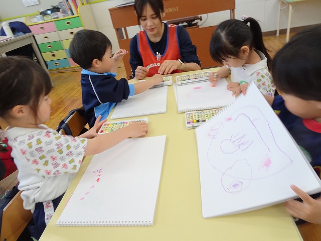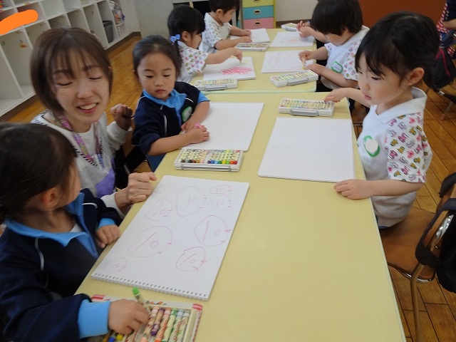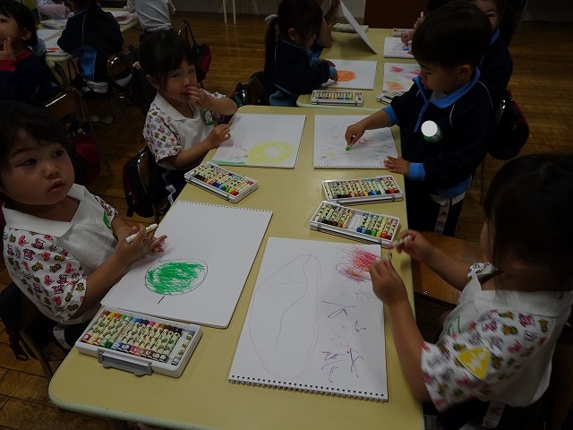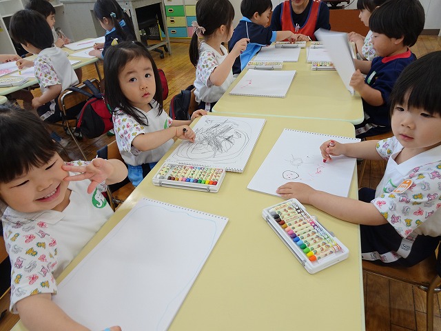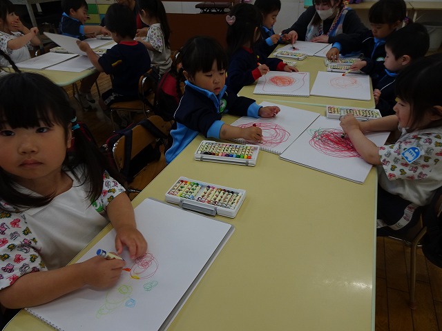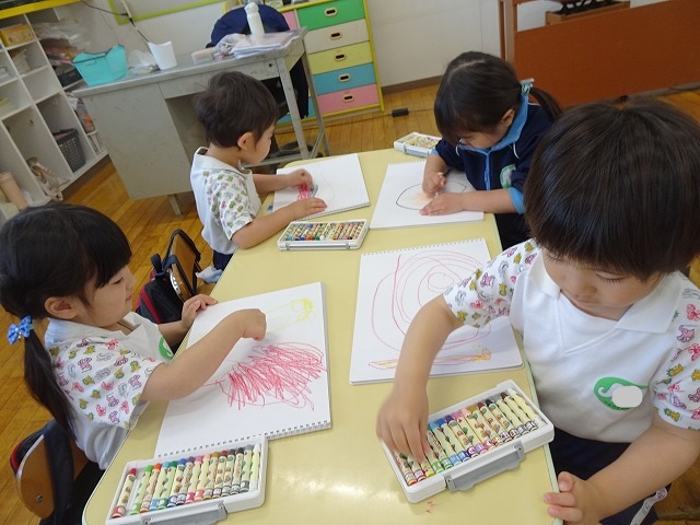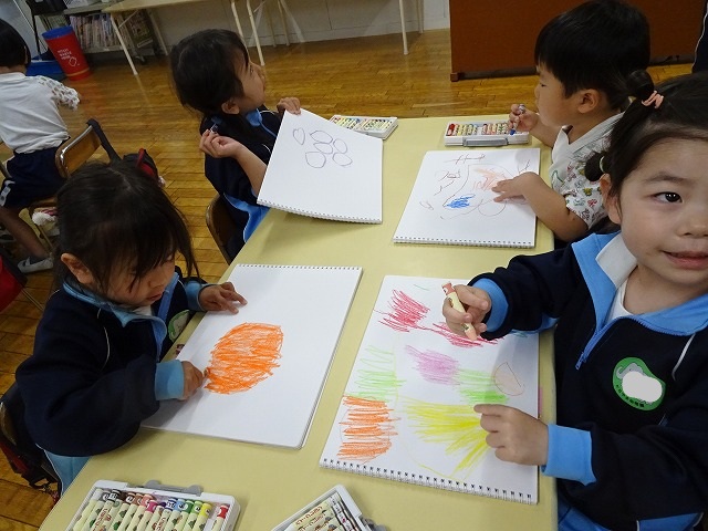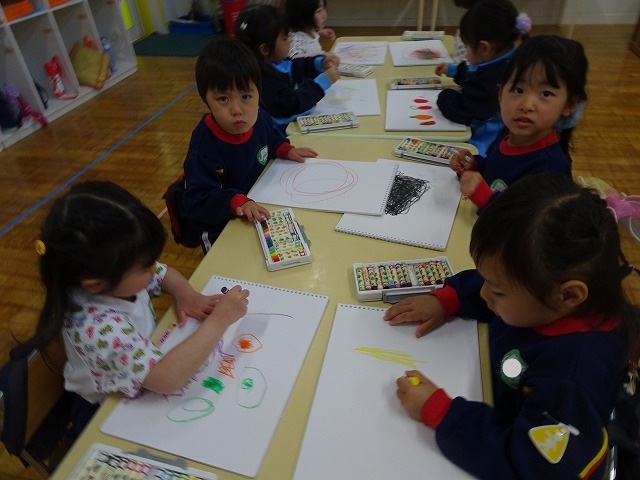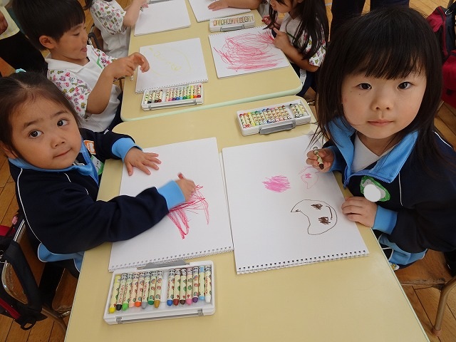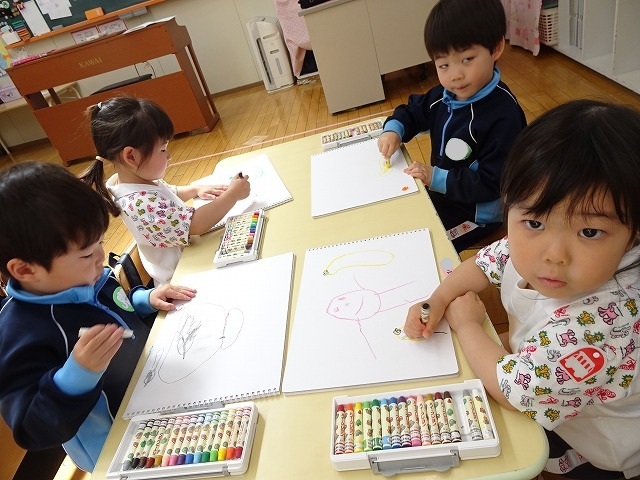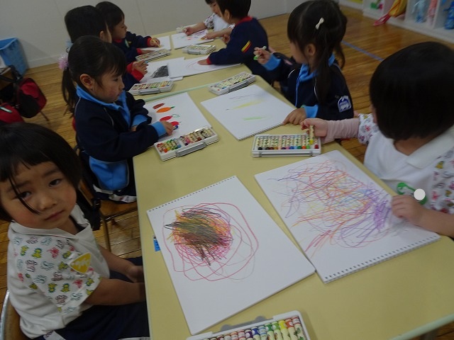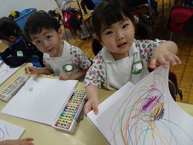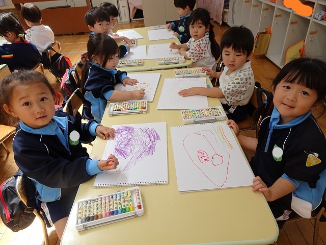 さて、本日は年少さんクレヨンを使って画用紙に絵を描きました☺