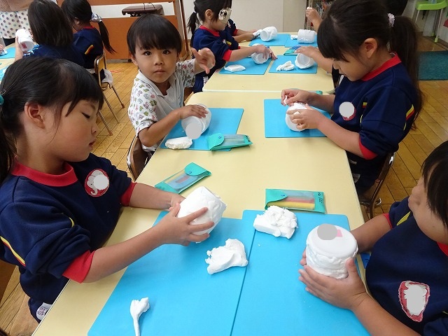 さて、年中さんでは紙粘土を使ってペン立ての制作です