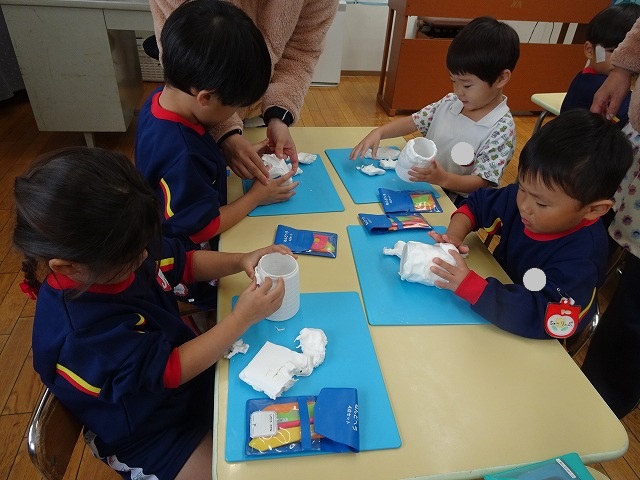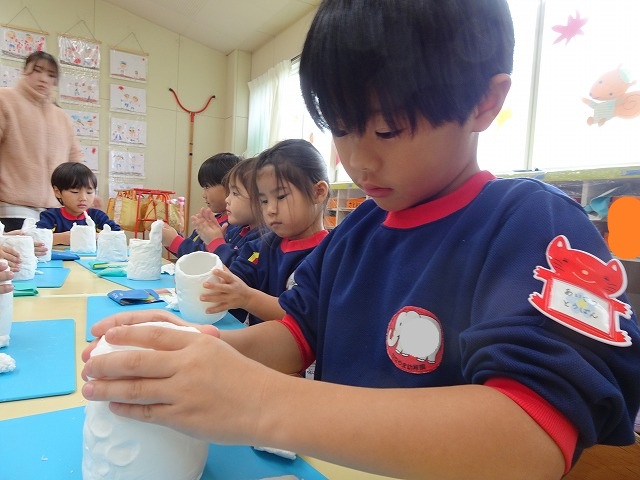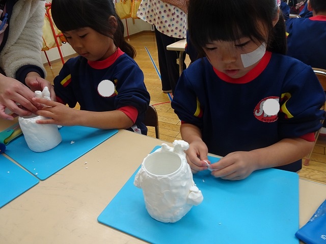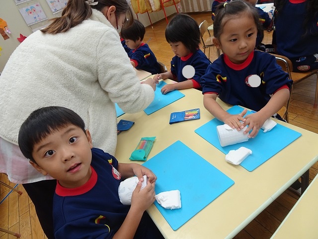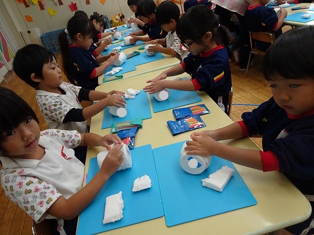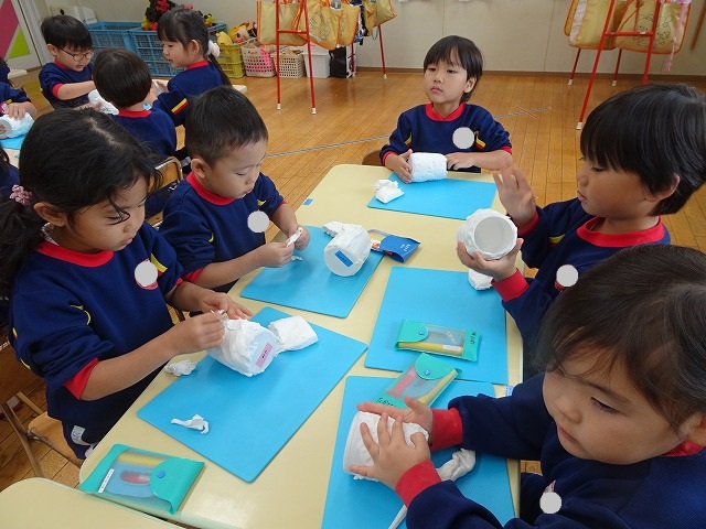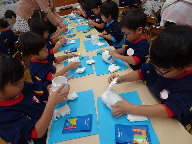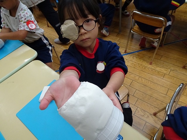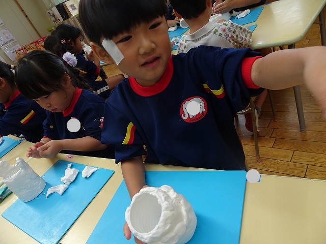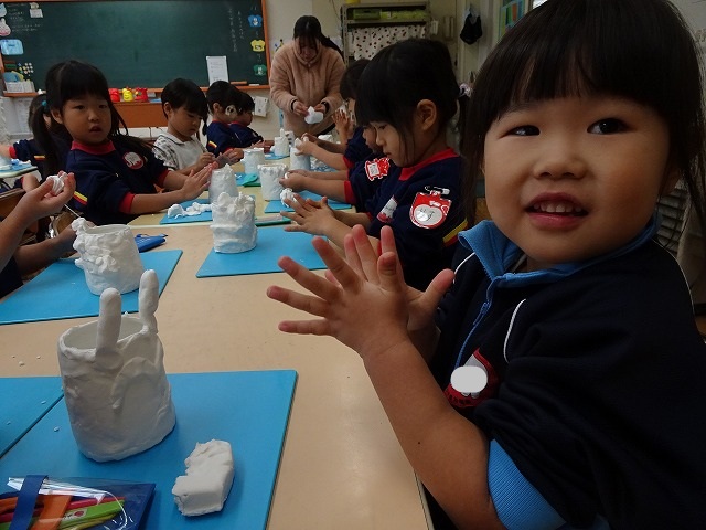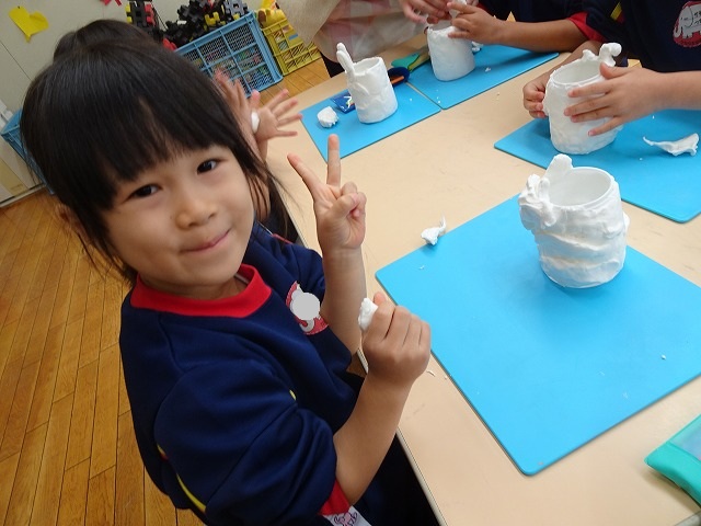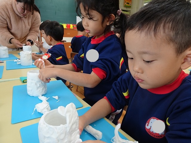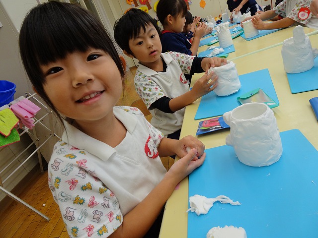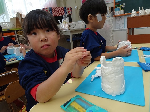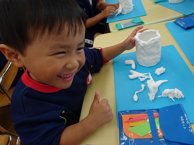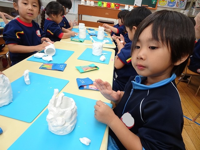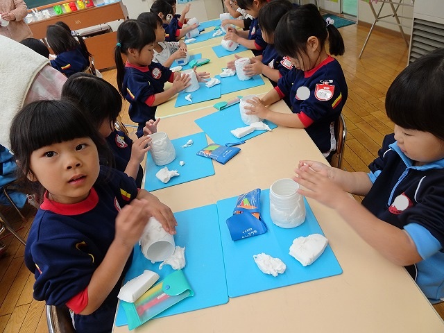 さて、年中さんでは紙粘土を使ってペン立ての制作です