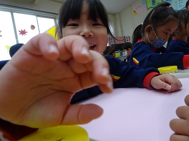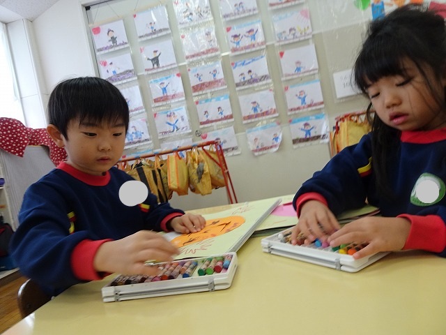 折り紙、クレヨン、絵の具となんでも上手に使って秋冬らしい制作帳での制作をしています✂