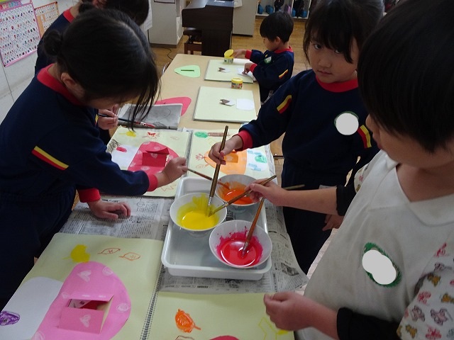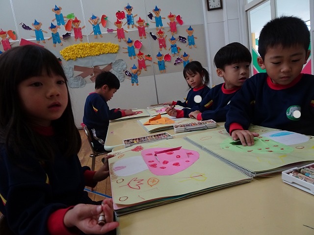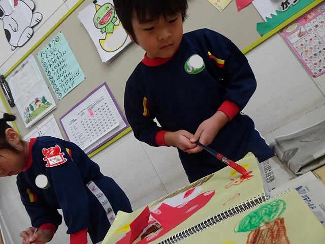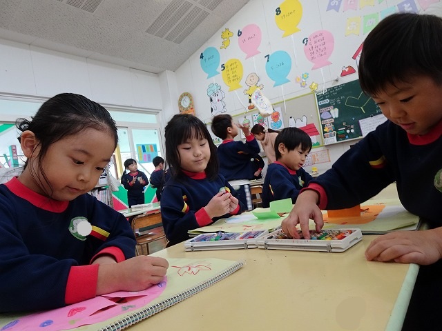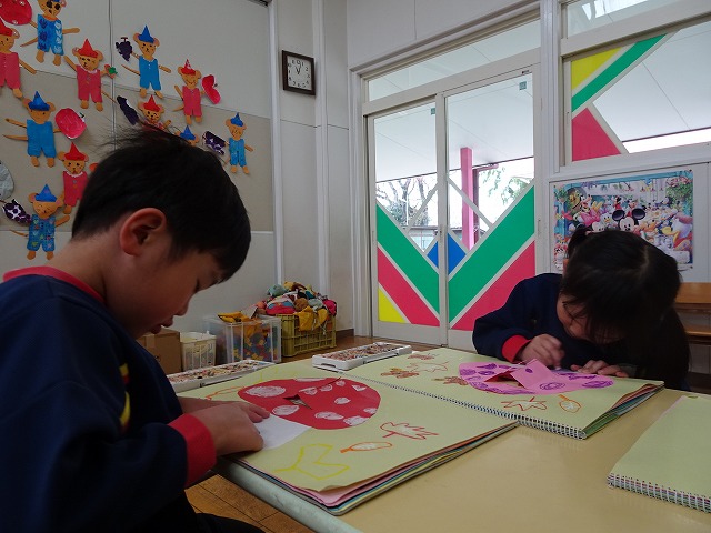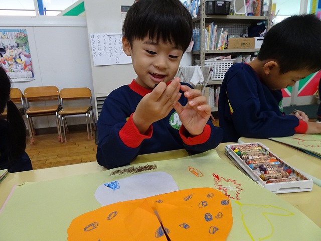 折り紙、クレヨン、絵の具となんでも上手に使って秋冬らしい制作帳での制作をしています✂