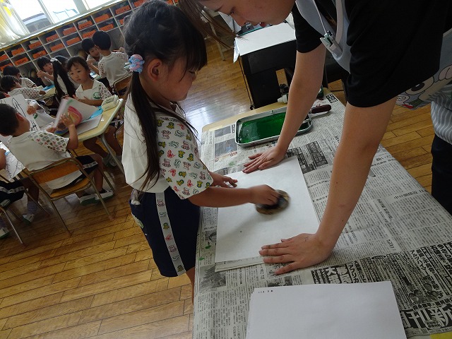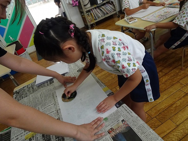 子どもたちは小さな手でバレンを握り、力の加減を探りながら円を描くように擦っていきます。