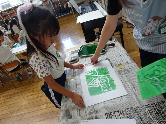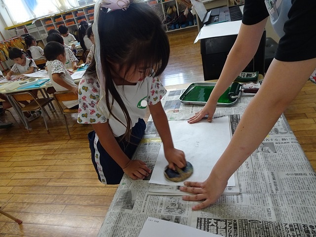 年長さんがバレンを握り、インクを擦る姿は、本物に向き合う小さな時間です。